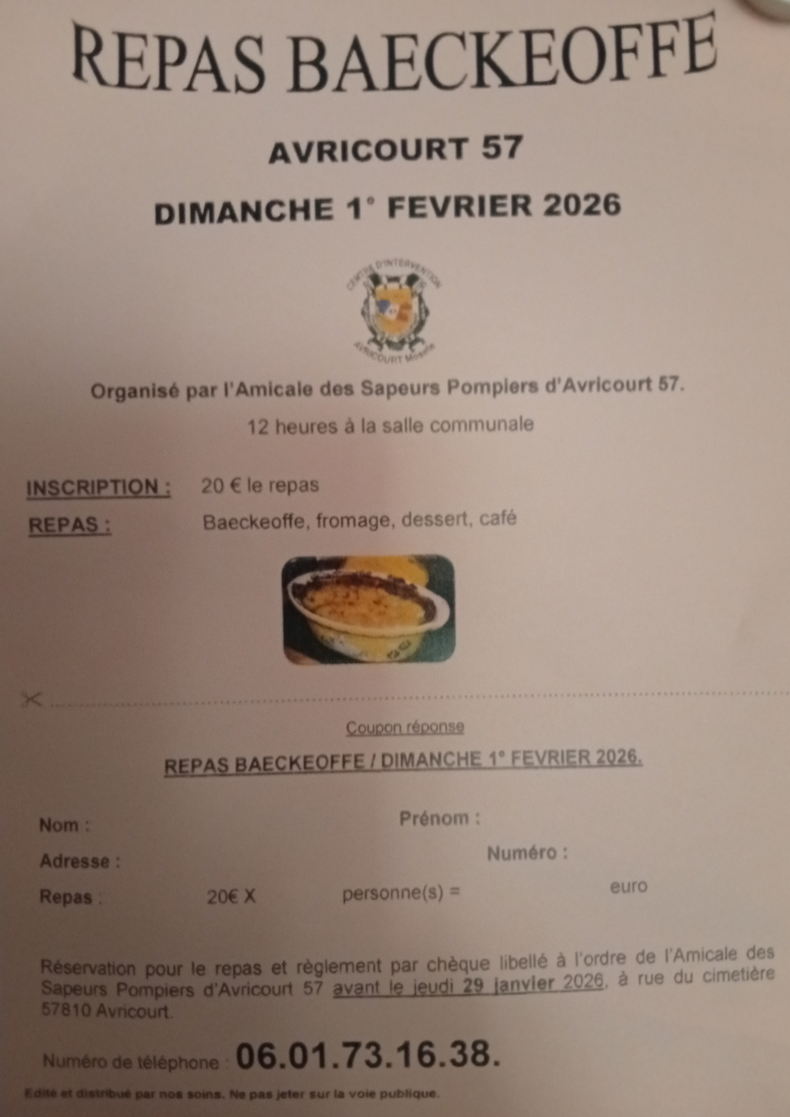 Vous êtes cordialement invité au repas Baecheoff organisé par l'Amicale des Sapeurs-Pompiers.